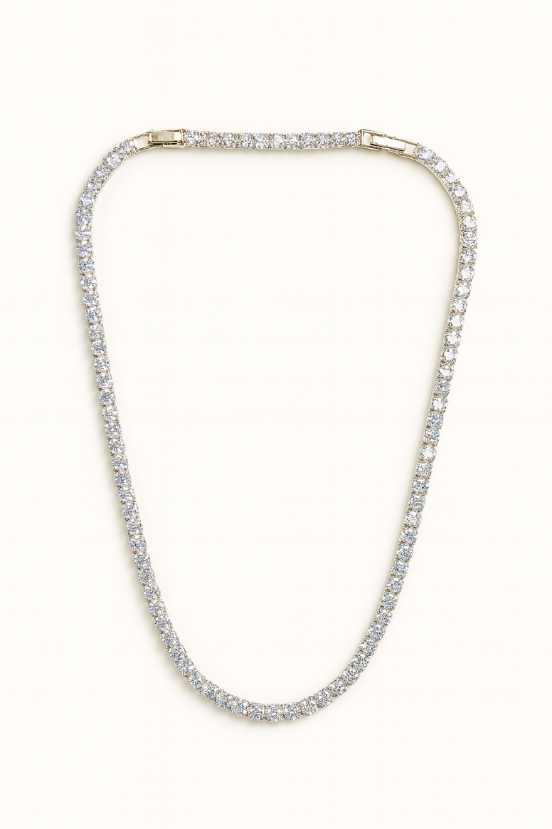 Elevate your elegance with this classic round-cut diamond tennis necklace, a timeless piece that embodies sophistication and luxury. Each shimmering zircon stone is precisely hand-set in a continuous line, creating a brilliant sparkle that captures the light with every movement.
