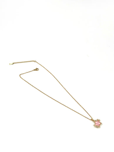 This charming piece features a star-shaped pendant crafted in a warm gold-tone finish. At its centre sits a glossy pink mother-of-pearl style stone, offering a dreamy iridescence that shifts beautifully in the light. Surrounding the star are small clear crystals that add a delicate sparkle without overpowering the design.
