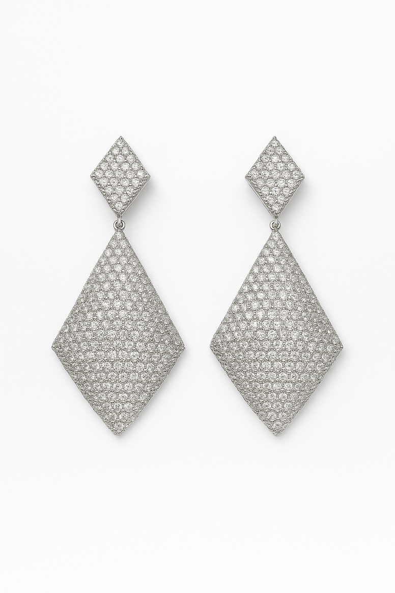 Make a bold and sophisticated statement with the Silver Geometric Pave Crystal Drop Earrings from MODA Accessories. Crafted with precision and style, these earrings feature a modern double diamond-shaped design, entirely encrusted with shimmering cubic zirconia crystals that radiate brilliance from every angle.